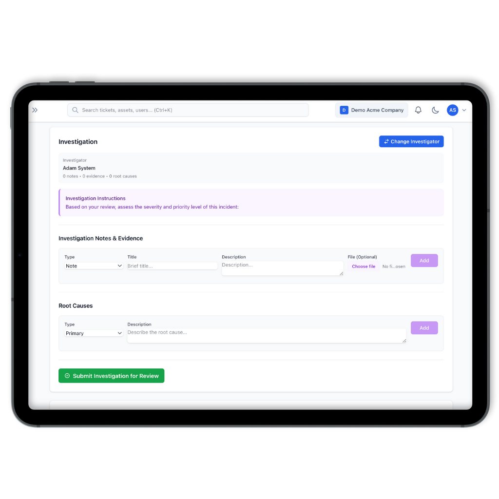 Instead of scattered emails and incomplete notes, every incident stays organised with evidence, status, ownership, and a clear history.